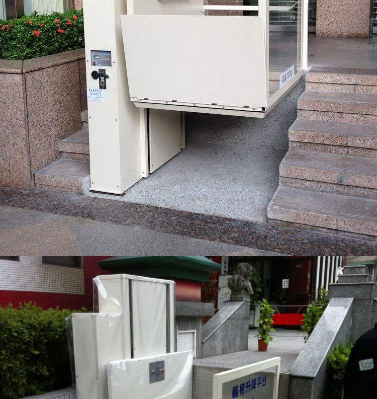無障礙升降機:是為殘疾人專門設計制造的升降機。為方便殘疾人出行及觀光,在社區,醫院,學校,賓館,酒店,公共場所等地方。旅游觀光梯通道的自動扶梯旁,安裝了無障礙升降機。無障礙升降機可容納輪椅車出入,殘疾人或行動不便者只需按一下兩端的求助按鈕,值班人員就會立刻開啟自動升降機.